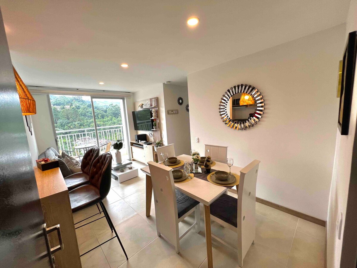 Enamórate de una increíble vista en el mejor sitio de la ciudad. Exclusivo apartamento de tres habitaciones habitación 1. estudio de trabajo , 01 cama doble de 140, 01 televisor Smart tv 42 pulgadas baño privado. habitación 2. 01 cama sencilla con nido de 01 metro habitación 3. 01 camarote de 01 metro y daño social con ducha comedor de 4 puestos , sofá cama, centro de entretenimiento con teatro en casa y televisor Smart tv de 52 pulgadas con Netflix y hermoso balcón, parqueadero privado.