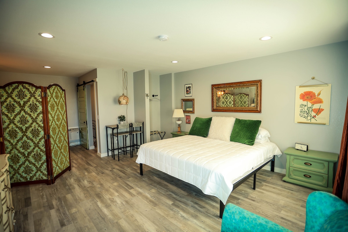 Mucho más que las habitaciones de un vaquero trabajador. The Bunkhouse ofrece privacidad en un entorno parecido a un parque. Tiene una minicocina pequeña en un espacio de estilo estudio. El baño tiene una sensación notable de vaquero/rústico. La minicocina pequeña cuenta con una cantidad limitada de provisiones diarias de uso común. Las fiestas más grandes pueden considerar nuestra otra oferta de alquiler, The Guest Quarters, ubicada a pocos pasos.
