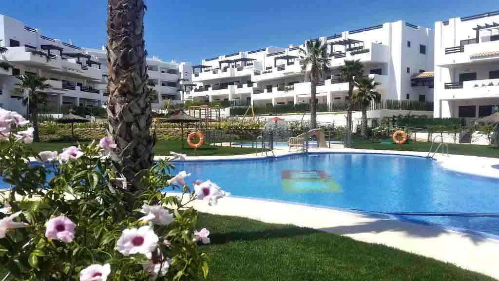 Urbanización frente a la playa. Lugar idóneo para parejas y matrimonios, para viajar en familia con niños. El entorno litoral es ideal practicar senderismo, running, montainbike, ciclismo, kayak. Tiene 4 piscinas y jacuzzis, parque infantil, circuitos biosaludables, jardines temáticos, laberinto de setos, zona deportiva con pista pádel. Centro comercial con gimnasio. Chiringuitos en la playa (Mar de Pulpí y La Entrevista). Localidades cercanas 15 minutos de Águilas y Mojacar.