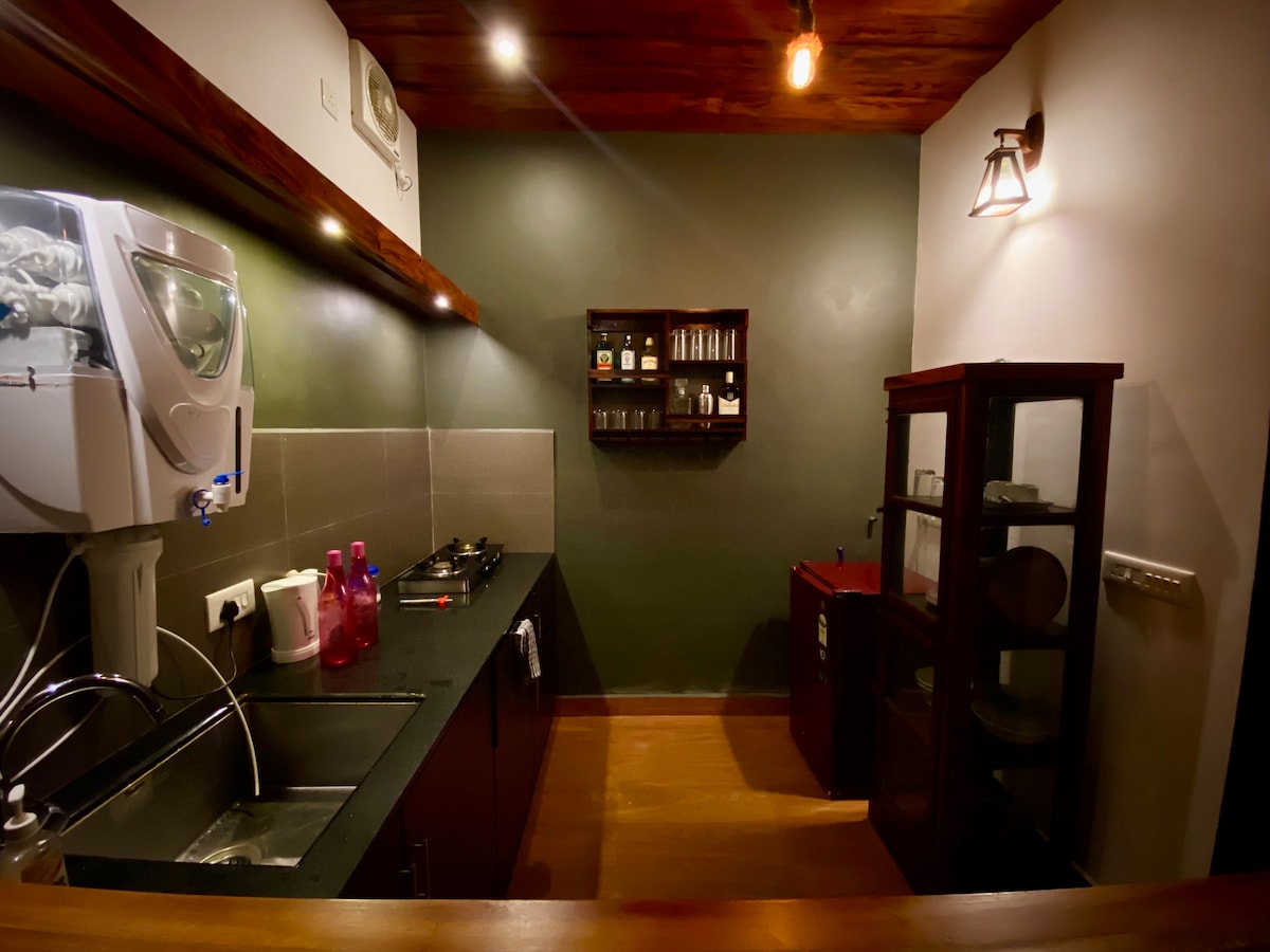 2BHK - Villa privada con cocina La casa cuenta con una amplia sala de estar de planta abierta equipada con un cómodo sofá, TV, comedor y cocina americana, que te ofrece mucho espacio para relajarte y entretenerte. Mientras disfrutas de las noches de brisa en el porche delantero, puedes ver cómo el cielo se transforma en un impresionante lienzo de púrpuras y rosas, ya que ofrece adiós al sol. Durante el día, puedes salir a tomar el sol, hacer castillos de arena o simplemente descansar en la playa de arena.