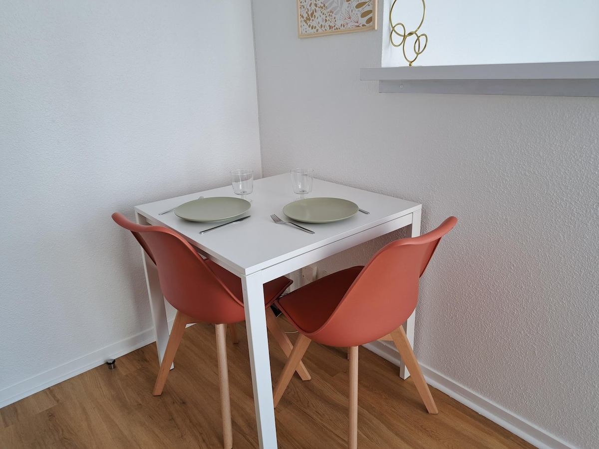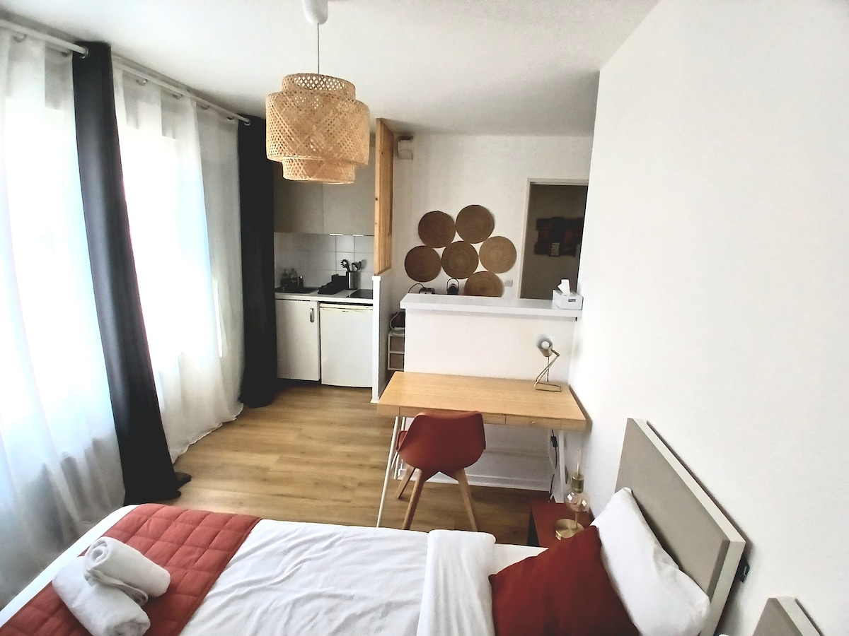 Estudio moderno, renovado con bonitas vistas 🅿️ Aparcamiento privado en un edificio a 300 m de seguridad, puerta motorizada con bip 🛜 Internet de muy alta velocidad y TV conectada con PRIME VIDEO Cocina totalmente equipada: microondas, vitrocerámica, campana extractora, cafetera Senséo, vajilla y utensilios de cocina completos Ropa de cama y toallas incluidas a la llegada Apartamento cuidadosamente preparado para una estancia cómoda y acogedora Cámara solo en el pasillo del edificio para evitar fiestas y abusos