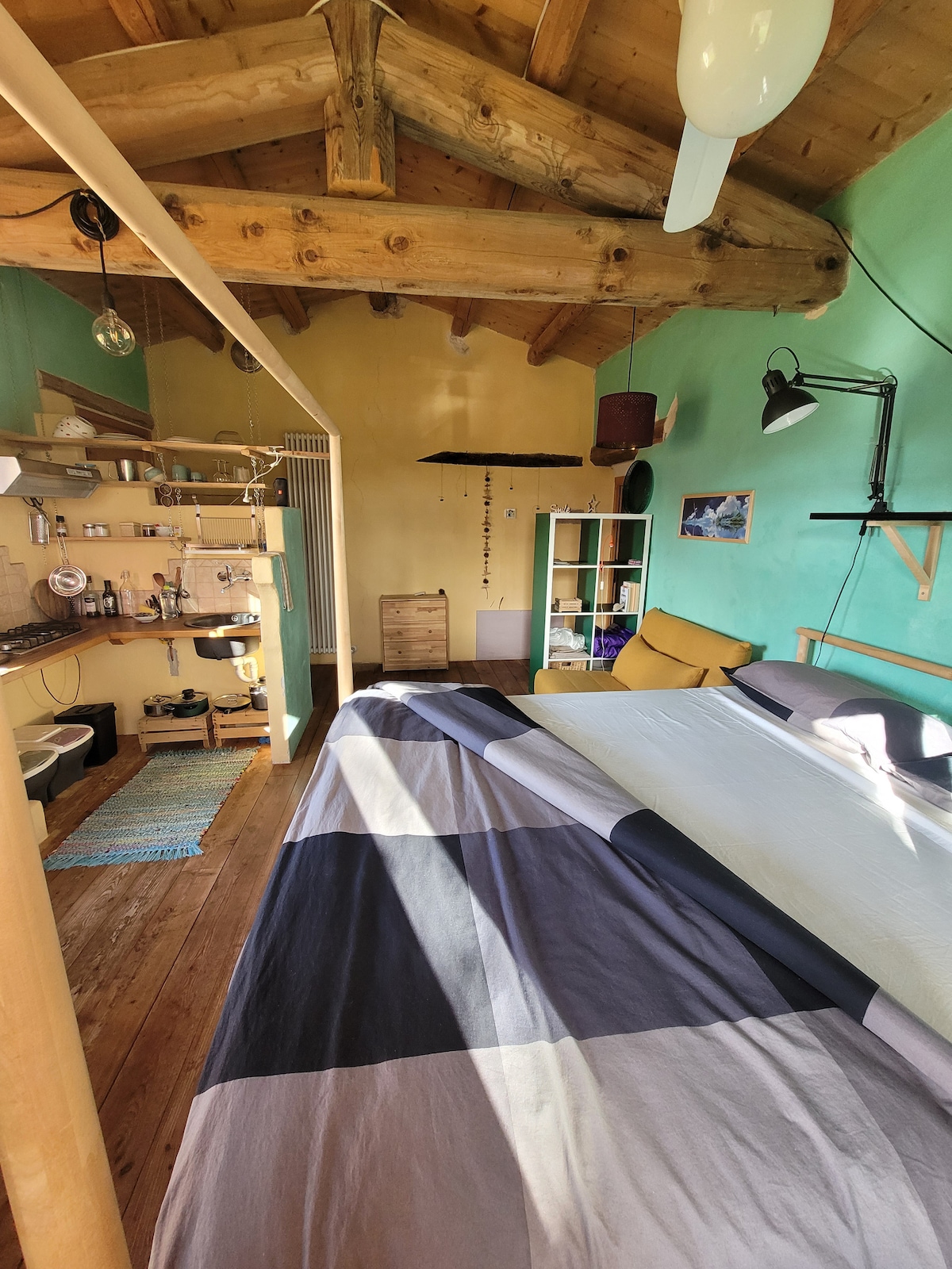 Originale e Autentica, bellezza e relax. Arredamento essenziale, simpatico e confortevole; pavimento di legno, travi a vista. La casa, immersa nel silenzio e nel verde, dall'interno da l'impressione di essere una singola casetta nel bosco. Bagno privato. Angolo cottura. Vista mozzafiato. A 5km. da San Severino! Volendo un bambino può dormire, su richiesta, nel piccolo divano letto.