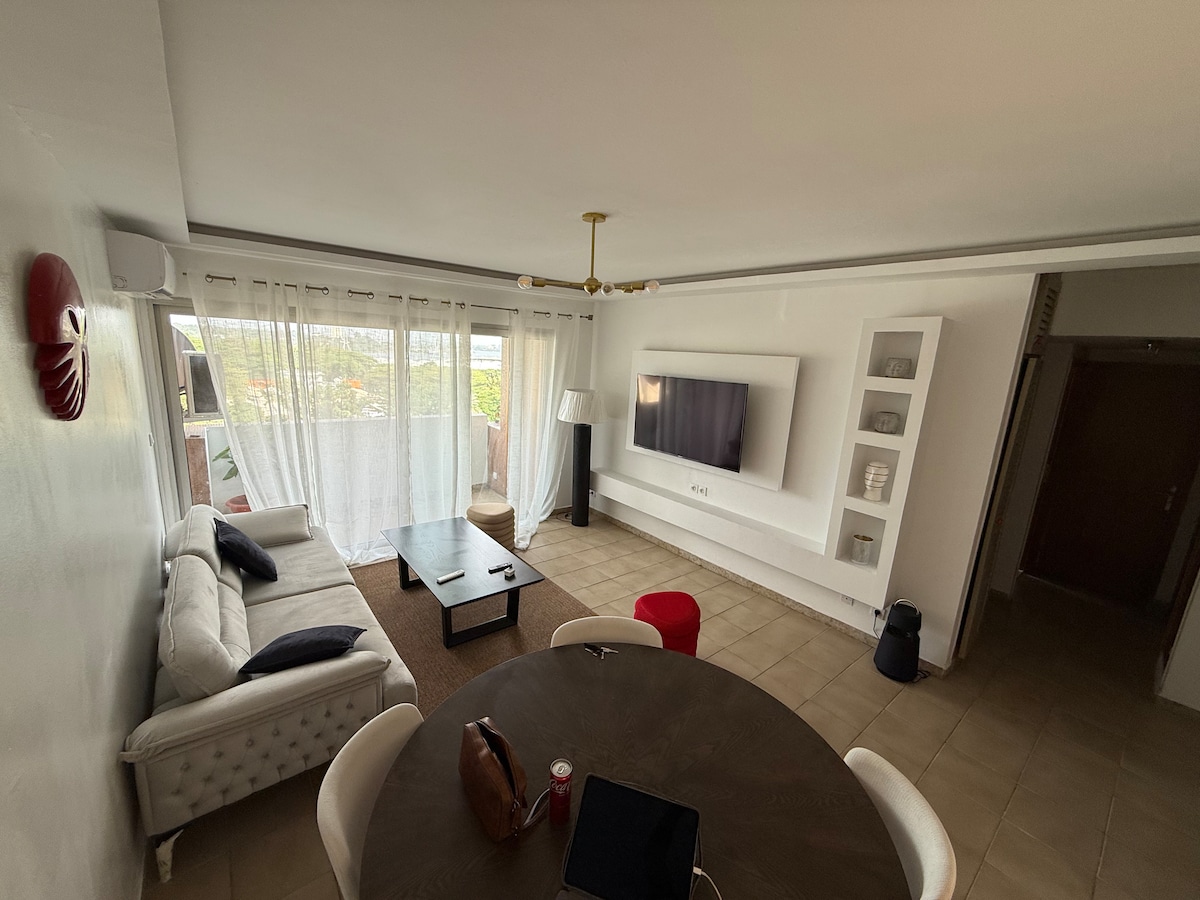 ★ ”..Alains Apartm. is well situated, he is a care taking..” Hortense ☞ 43” SMARTTV with Android ☞ 50MBs Wi-Fi ☞ 7/7 Guard ☞ central location ☞ modern afric. Design ☞ Access to Pool ☞ Near the business district «le Plateau» ☞ Near the beach ☞ easy transportation ☞ surrounded by Intern. Restaurants and Malls » 1 Min drive to Casino (Supermarket 24H, 7/7) » 1 min drive to the Mall Cap Sud » 5 Min Drive to Carrefour Supermarkt (24H,7/7) » only 6 Km from the Airport