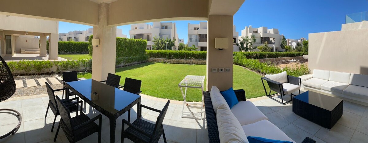 Chalet de planta baja totalmente terminado en Hacienda Bay, costa norte, Egipto. Amplio chalet amueblado de 170 m² con un jardín privado de 200 m², idealmente situado en la exclusiva comunidad de Hacienda Bay. • 2 dormitorios principales • 3 baños modernos en total • 2 elegantes salas de estar con sofás cama, ideales para huéspedes adicionales • Cocina totalmente equipada. • Comedor elegante. • Todas las habitaciones tienen aire acondicionado • Vista directa a la piscina • Acceso a todas las playas y piscinas