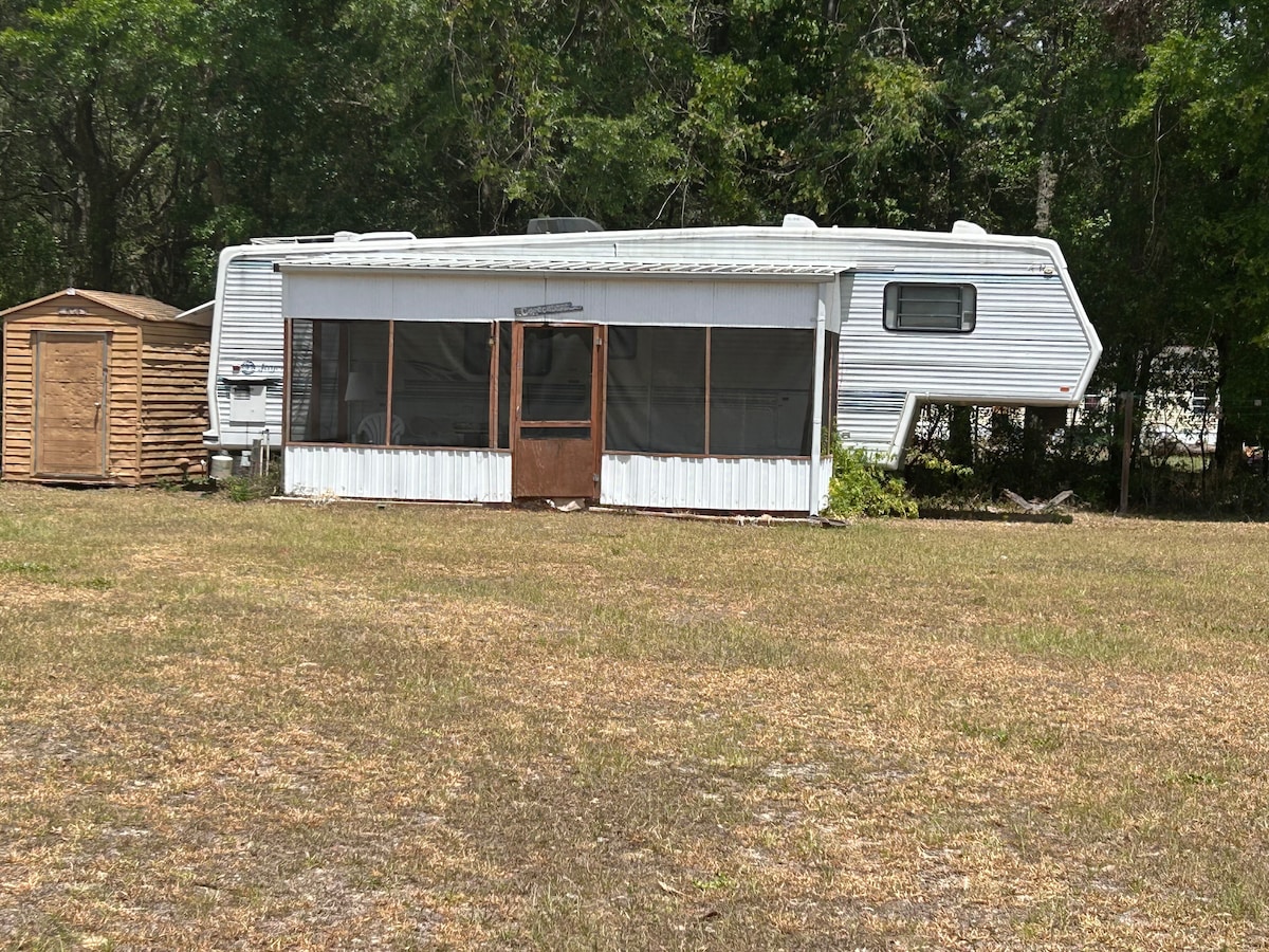 Si desea desconectarse y disfrutar de una escapada tranquila en el bosque, este es el lugar ideal para usted. Acogedora casa rodante ubicada en un entorno tranquilo cerca de Rainbow River. Sencillo, limpio y relajante. ✨ Capacidad para 3 personas cómodamente • Cocina completa • Baño privado dentro de la casa rodante 🔥 Disfrute de su propia fogata privada o solicite acceso a una fogata compartida más grande en la parte trasera de la propiedad. 🌿 Cerca de manantiales, de la naturaleza y de aventuras al aire libre Ideal para amantes de la naturaleza, parejas o familias pequeñas que buscan una escapada tranquila.
