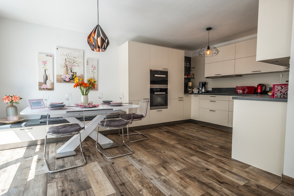 El acceso al apartamento Charme es un poco empinado, con una pendiente del 24 %, pero el camino definitivamente vale la pena. La vista del Untersberg es impresionante. El apartamento está cuidadosamente renovado y te invita a relajarte. Desde la cama, el balcón y la sala de estar, tienes una vista directa del Untersberg