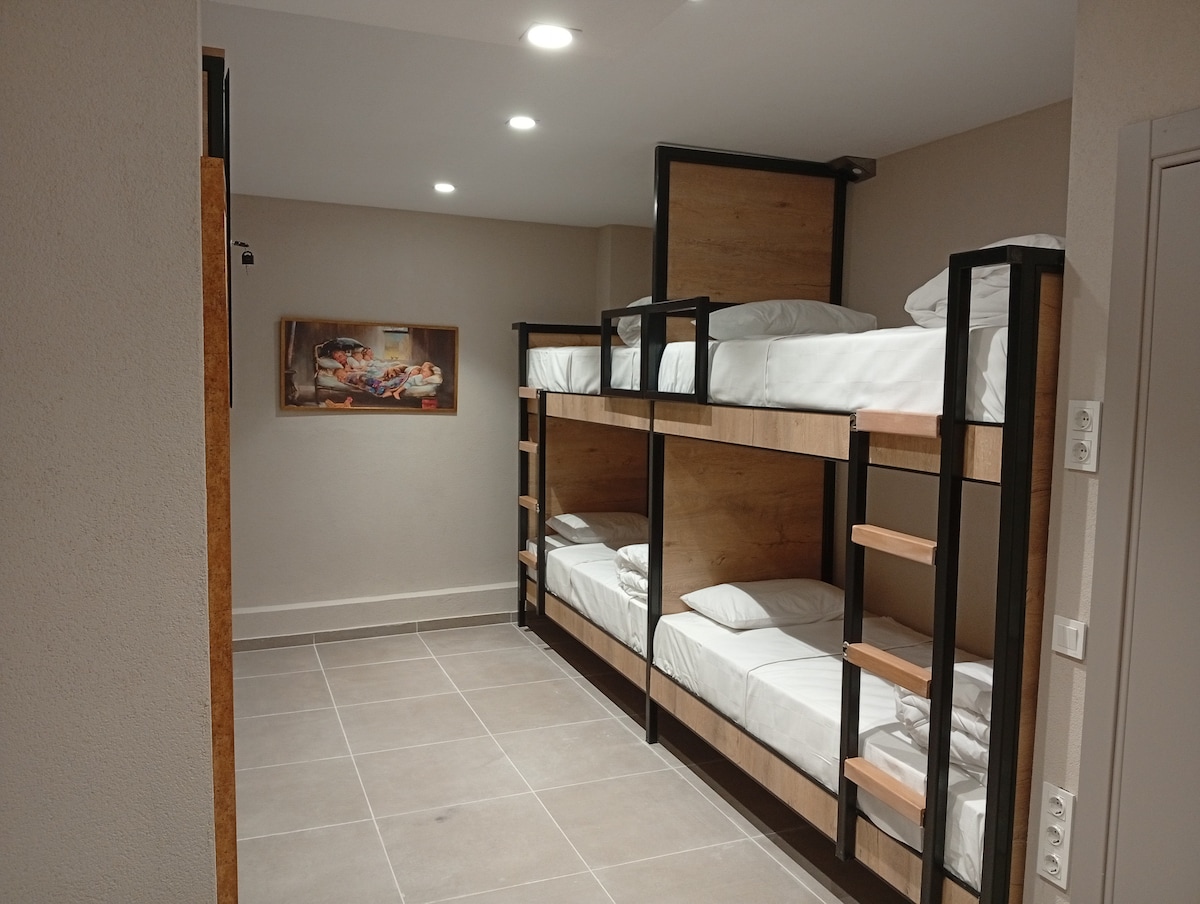 Habitación para 6 personas (como máximo 6 personas pueden alojarse) 6 literas (190 cm x 90 cm) Aplicación. Tamaño de la habitación: 15 m2 Desayuno con luz de lectura. Vista a la calle. No es posible reservar una cama inferior o superior. Baño privado las 24 horas agua caliente Salida flexible. Sistema de calefacción central. Aire acondicionado Depositar caja Sábanas limpias y frescas ¡Conexión Wi-Fi gratis! Servicio de despertador No se permite fumar
