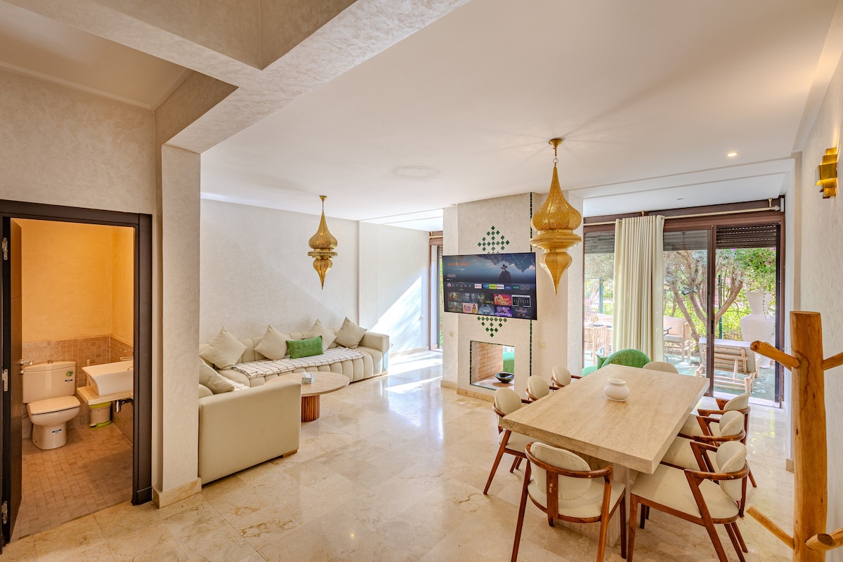 Regálate un descanso en esta magnífica planta baja en Prestigia Opale. Este apartamento tiene 2 elegantes dormitorios, una hermosa terraza, un jardín privado de 50 m², cine en casa, jacuzzi climatizado, acceso directo a la piscina. Aire acondicionado, wifi, Netflix y aparcamiento seguro están a su disposición. Residencia de lujo con campo de golf, a 10 minutos del centro de la ciudad y a 2 minutos del aeropuerto en coche. Tranquilidad, lujo y vistas impresionantes del Atlas. Ideal para una estancia en pareja, en familia o con amigos