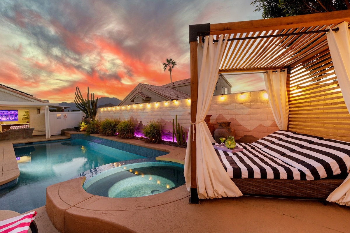 Bienvenido a Desert Social, ¡tu mejor oasis de vacaciones! Perfecto para grupos de todos los tamaños, este elegante refugio junto al lago ofrece lujo, diversión sin fin y fácil acceso a festivales, tiendas, restaurantes y Palm Springs. Con una impresionante zona al aire libre, piscina de agua salada, spa, sauna, sala de juegos, minigolf, juguetes, cine en casa y mucho más, hay diversión para todos. Senderismo a 3 minutos en coche. Tienda de comestibles a 5-10 minutos en coche Campos de golf a 2-7 minutos en coche Mejora tu estancia con diversión y elegancia; detalles a continuación