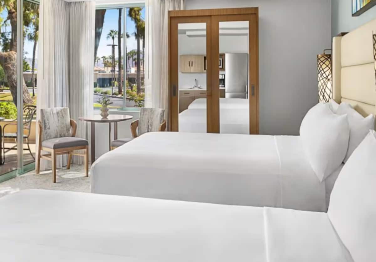 Visit Palm Springs and stay in our two-bedroom garden suite, located in the zen courtyard and offers a quieter, more private stay. Each suite features a living area, kitchen with a refrigerator and stove top, a king-sized bed in each room, two full bathrooms, and a patio or balcony with a hammock chair. The well-appointed rooms include handmade furnishings from Mexican artisans, streaming TV, free WiFi, a coffee maker, an in-room mini bar and stocked pantry for purchase.