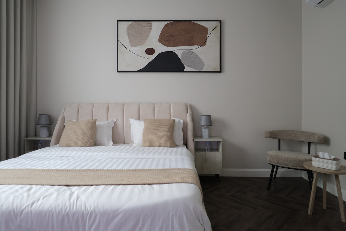 Alójate en un moderno apartamento en Medina, una estancia serena a pocos pasos de Masjid Quba. Cerca de Quba Masjid, centro comercial y Aliat Mall. Disfruta de una espaciosa residencia con un diseño moderno que incluye aire acondicionado central y duchas con efecto lluvia.