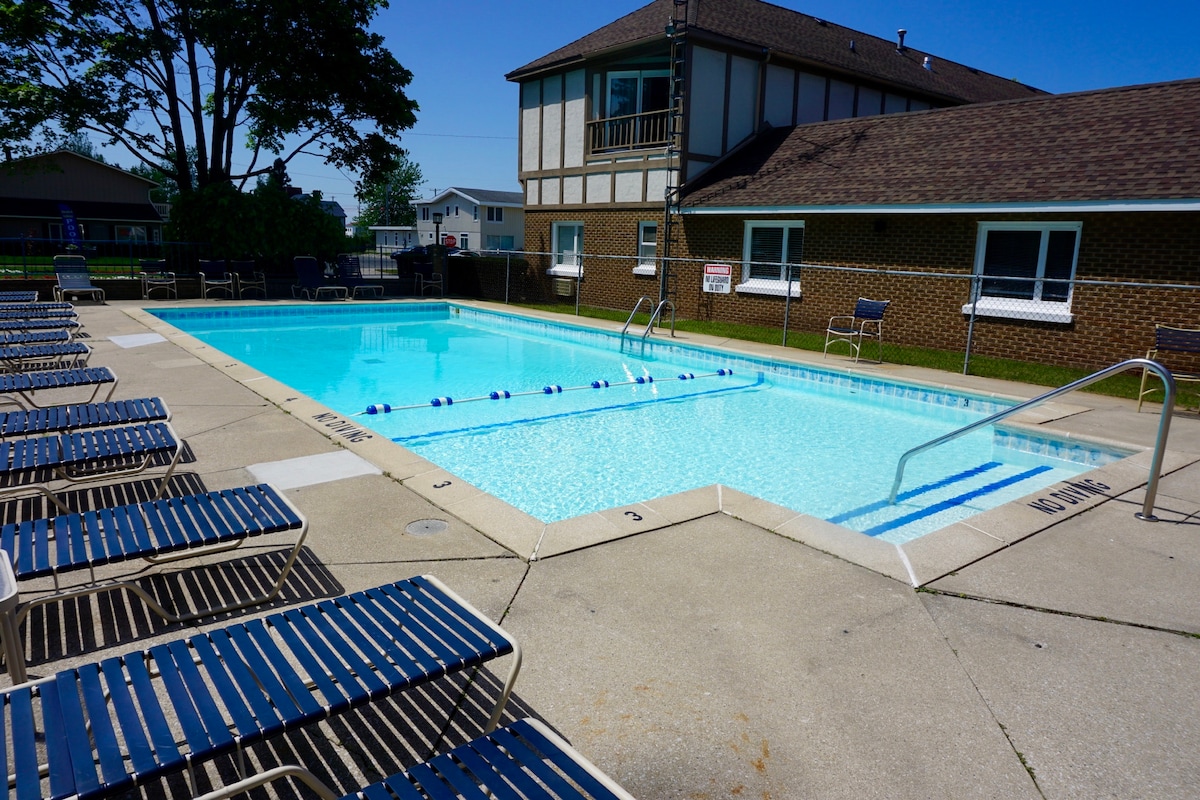 "Lakeside Escape", que alquila de viernes a viernes, es un amplio condominio generosamente amueblado de 3 dormitorios y 2 baños con capacidad para seis personas. Dos encantadores balcones con vistas a la piscina y al parque frente al agua. Al otro lado de la calle se encuentra el lago Michigan, con pintorescos senderos para caminar y hermosas vistas. Convenientemente ubicado a poca distancia a pie de City Beach, Stearns Park, Rotary Park, Maritime Museum, Children 's Museum, City Marinas, Downtown Shopping & Restaurants, y a poca distancia en auto del Parque Estatal Ludington.
