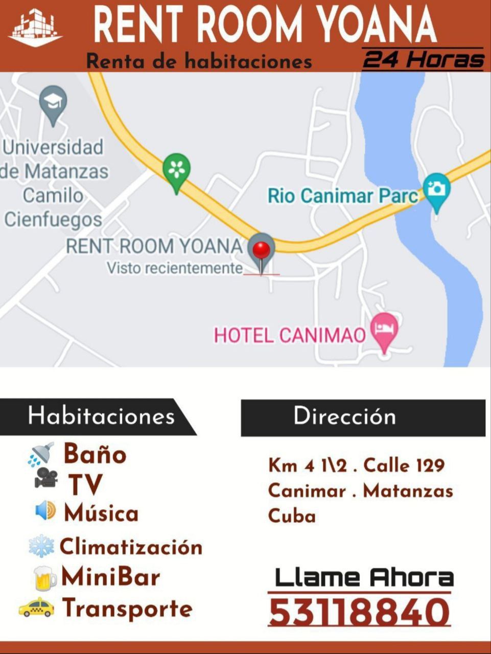 La casa es una construcción nueva con una escalera independiente que lo lleva al segundo piso que es donde están las habitaciones. Las habitaciones son frescas y espaciosas y cuentan con aire acondicionado. Hay servicio local de ómnibus a Varadero donde pueden encontrar otros lugares de interés como bares, cafeterías y restaurantes, también puede encontrar áreas de internet WiFi. La casa posee parqueo privado.