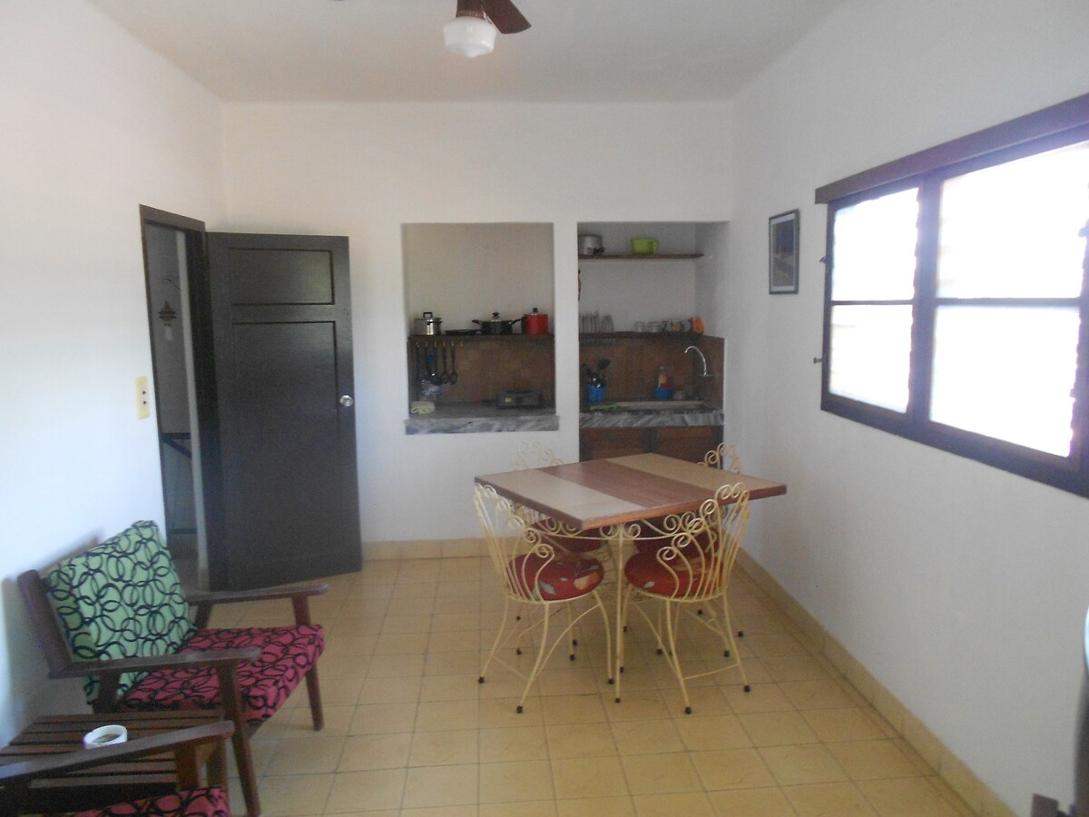 Es un apartamenento independiente amplio. Con un dormitorio con dos camas, (una grande y otra más pequeña), aire acondicionado, caja fuerte, perchas para la ropa. Un baño con agua fría y caliente; cocina equipada con todo para la elaboración de alimentos (microondas, cafetera, tostadora, ollas, fogón de gas, refrigerador), barra y tres taburetes para comer, sala con televisor y una terraza común rodeada de plantas con sillones, mesa y sillas y un hermoso jardín. Pueden utilizar la lavadora.