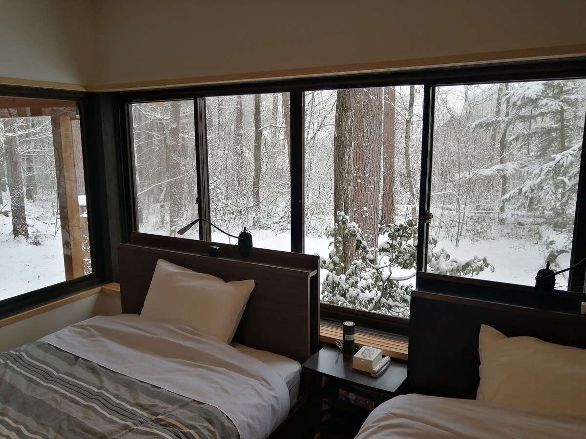 Edificio B STAYCHELIN 2025 Una villa privada completa de nueva construcción con un tranquilo jardín forestal de 100 tsubo (1500 ㎡).La posada principal apareció en la pared de la ensalada de viaje y Ariyoshi. Siéntete como en casa en esta amplia villa.Es un espacio exclusivo para una casa entera en un bosque rico en naturaleza.En el tranquilo salón, disfruta del acogedor calor de la chimenea y de Netflix con el último proyector Aladdin.Se recomienda un momento de relax para refrescarse en el jacuzzi al aire libre después de calentarse hasta la médula en la sauna para hasta 7 personas. La amplia terraza de madera da a la naturaleza.Hablando de experiencias especiales, cenas al aire libre con una parrilla de gas (por un cargo).Hablar alrededor de una hoguera y leer con vistas al bosque también es un lujo. Hay 3 dormitorios con un cómodo colchón Simmons, con una capacidad máxima de 10 personas.Para reuniones aún más grandes, también puedes usar los dos edificios adyacentes. Entre los servicios se incluye una de las certificaciones ecológicas más importantes de Italia, así como electrodomésticos de cocina Balmuda y una lavadora y secadora.Te lo pasarás genial en esta villa con atención al detalle.