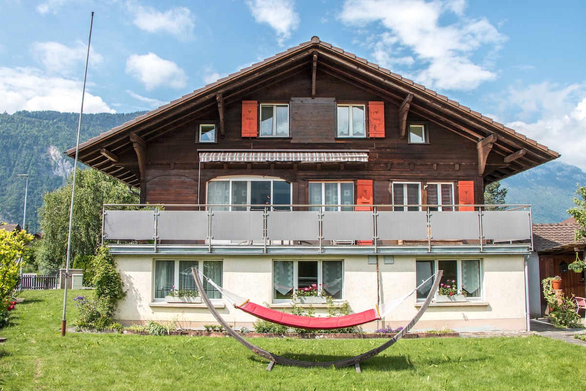 Cozy apartment in a Swiss Chalet for 4 guests. To guarantee peace + quiet in the house, children are only allowed from the age of 13. Located in the neighboring village of Interlaken. In a quiet place in the middle of nature and not in the busy center. Unique view of the Jungfrau and an ideal starting point for excursions to the Jungfrau Region.A car is recommended, because the apartment is on a little hill with 5 minute drive to the center of Interlaken.Nearest bus stop is a 15 minute walk away