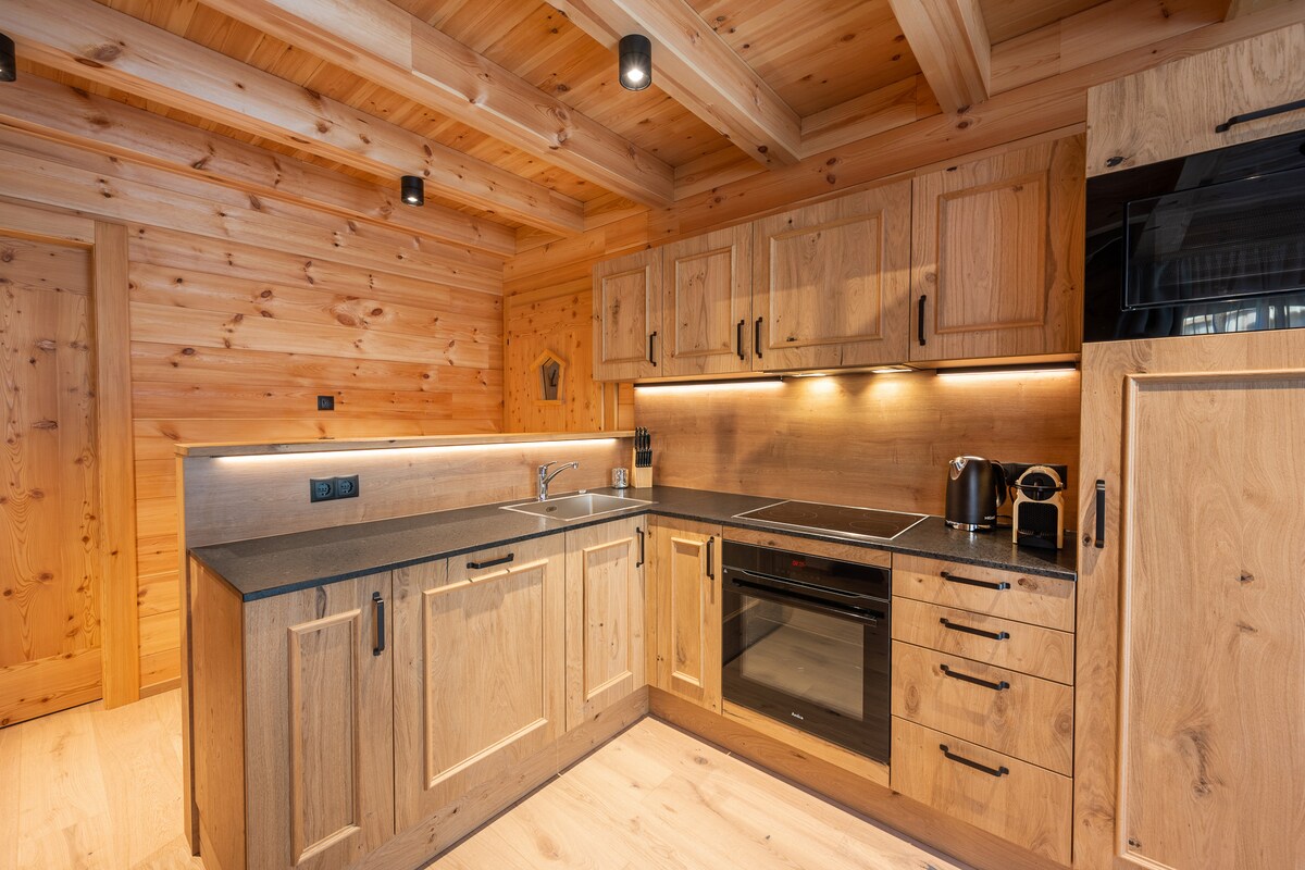 Arquitectura y estilo de vida alpino - usted está de vacaciones en el chalet en 190m². Tres amplios dormitorios con una cama doble y un sofá cama, cada uno de los cuales puede ser separado por una puerta corredera y por lo tanto puede acomodar de dos a cuatro personas. El chalet también tiene su propia sauna y para los esquiadores, una sala de esquí con secador de botas calentable. Disfrute de acogedoras chimeneas en la sala de estar y una vista del hermoso paisaje de montaña desde todas las habitaciones de la casa.