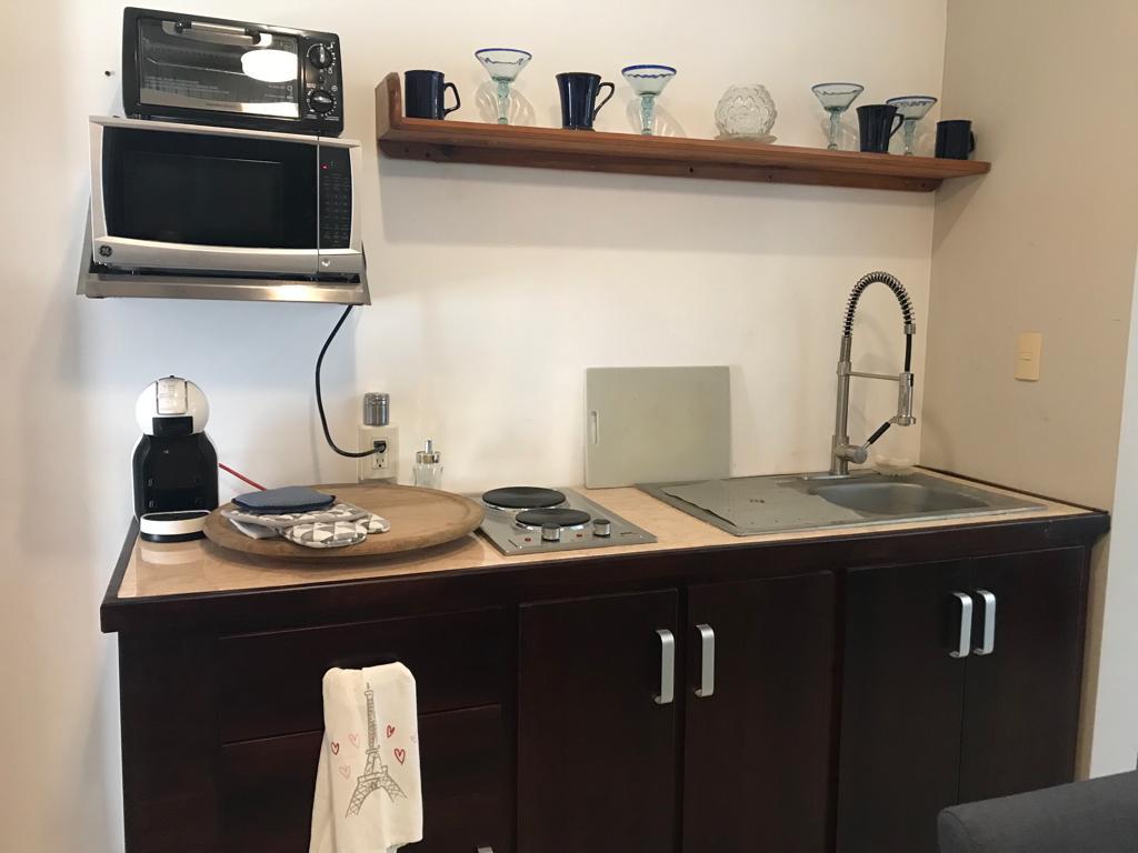 Estudio con todo lo necesario para descansar cómodamente, cama queen size, cocina integral, baño completo, aire acondicionado, televisión, internet y cable. El estudio es completo, el acceso es desde la calle. Situado en el corazón del centro histórico a cinco cuadras de plazuela machado, se puede caminar a la plazuela, catedral, al mercado pino suárez, al malecón, olas altas. Cerca pasan todas las rutas de camiones que llevan también a la zona dorada. Justo en la esquina hay un café.