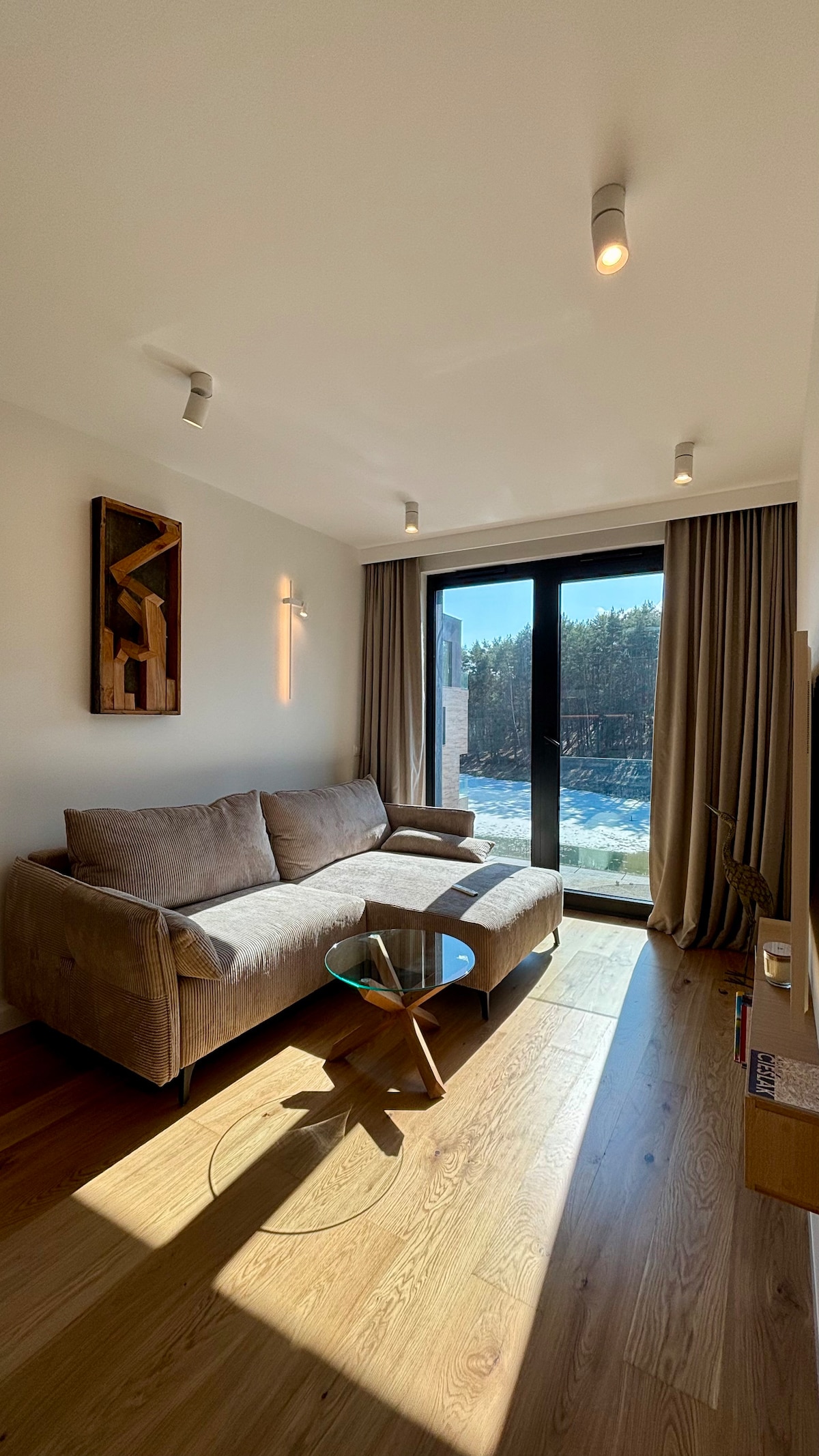 Odpręż się i zrelaksuj w tej spokojnej, stylowej przestrzeni. Ciesz się pięknym widokiem warmińskiego lasu za oknem . 300 metrów od apartamentu znajduje się plaża nad największym olsztyńskim jeziorem Ukiel. 200 metrów marina, restauracja, studio treningu ze SPA, punkty widokowe na jezioro z panoramą miasta. Dokoła ścieżki pieszo- rowerowe. W odległości około 1 km Park Handlowy Aviator. Czeka na Ciebie bezpłatne miejsce parkingowe i stacja ładowania auta elektrycznego.