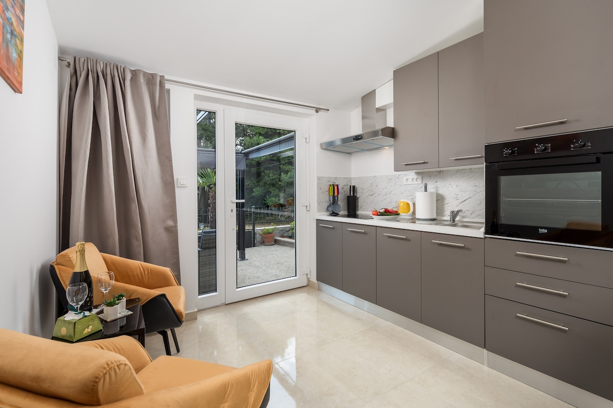 El apartamento está situado cerca del centro de la ciudad de Opatija, a solo unos minutos en coche o a ocho minutos a pie. Consta de una sala de estar, dormitorio, un comedor, dos baños, cocina, sauna, salón de espacio abierto, terraza, un jardín circundante y un estacionamiento. Gracias al hecho de estar en la planta baja con un jardín circundante, tienes la sensación de alquilar una casa y no un apartamento.