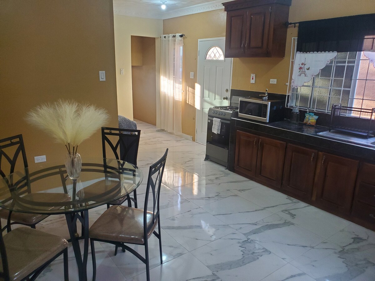 Nuestro encantador hogar está situado en las frescas colinas de Manchester. Se encuentra en un complejo cerrado seguro en Ingleside, Mandeville. Mientras estés aquí, la tranquilidad y la relajación están garantizadas, ya que estamos ubicados lejos del bullicio de la ciudad; sin embargo, a pocos minutos se encuentra el centro comercial y los restaurantes para tus compras y comidas. La casa cuenta con un dormitorio tamaño king y un futón (sofá cama) para dormir una persona, 1,5 baños, cocina, comedor y sala de estar con muebles elegantes.
