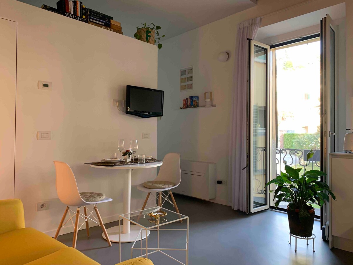 El apartamento Hydrangea es un nuevo estudio doble de lujo (dúplex) dentro de la torre en la parte superior de Villa Monti (una elegante villa liberty de 1910 en Varenna) con una impresionante vista panorámica de 360° del lago de Como.