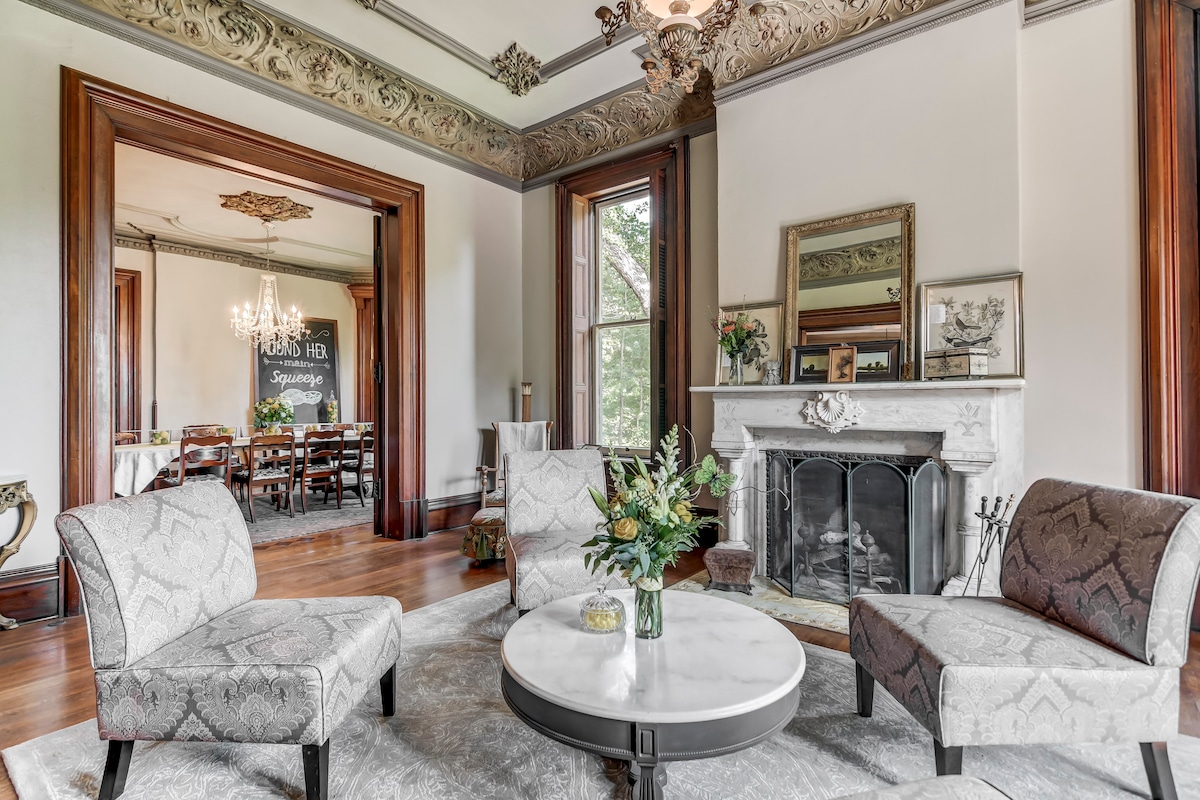 Perched high atop one of Petersburg's many hills, this beautiful Italianate Mansion enjoys a birds-eye-view of historic Petersburg. The home is nestled among beautiful trees and landscaping in a quiet, peaceful setting. We are located a half mile from the town square.