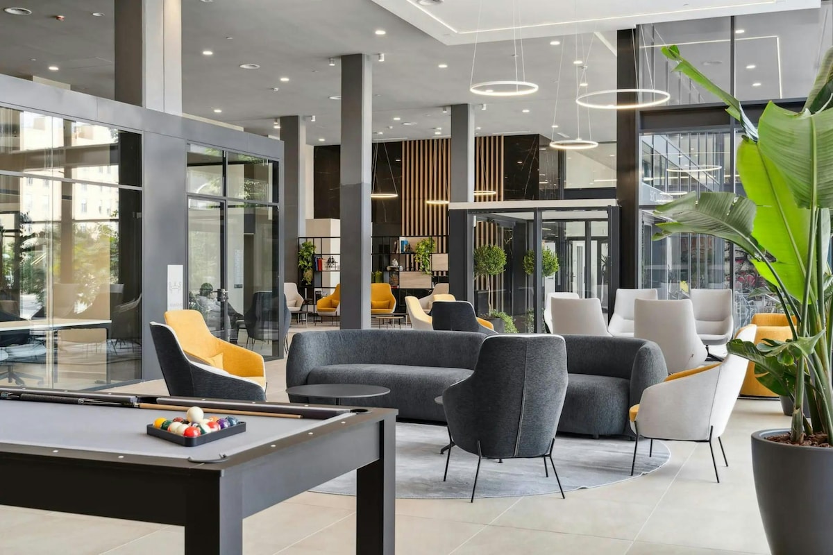 Disfrute de una experiencia elegante en este lugar céntrico. Nuevo apartamento totalmente amueblado y decorado con eletronics de primera calidad y muebles de diseño. Precioso balcón con vistas al parque y a las 4 torres de Passeo Castellana. Dos piscinas, una en la planta baja y la segunda en la azotea con una vista de 360 grados de Madrid. También hay estacionamiento, gimnasio y espacio de trabajo conjunto.