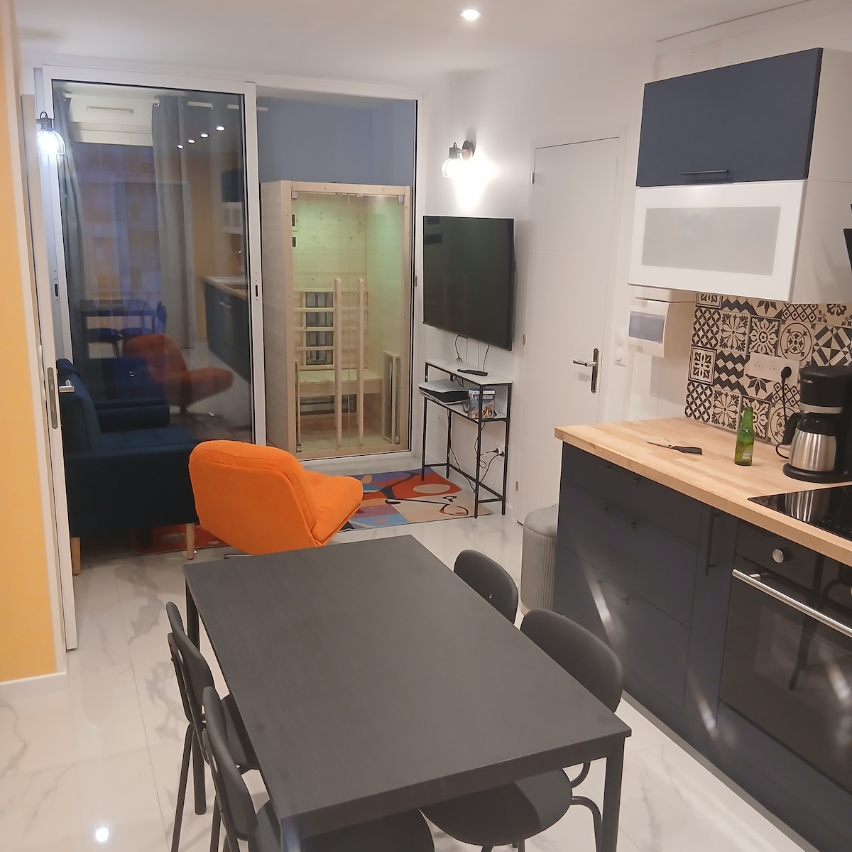 Este alojamiento tiene un estilo decididamente único. Un apartamento de alto standing para momentos de relajación e intimidad en un contexto lujoso. Una sala de estar abierta a la cocina equipada con un proyector de vídeo gigante y un cine en casa para sumergirse por completo en una noche de relax. Amplia habitación con una cama QueenSize (160x200) de lo más cómoda. Un lujoso baño con ducha a ras de suelo que incluye un jacuzzi para 3 personas y una sauna para 3/4 personas con acceso directo a la habitación.