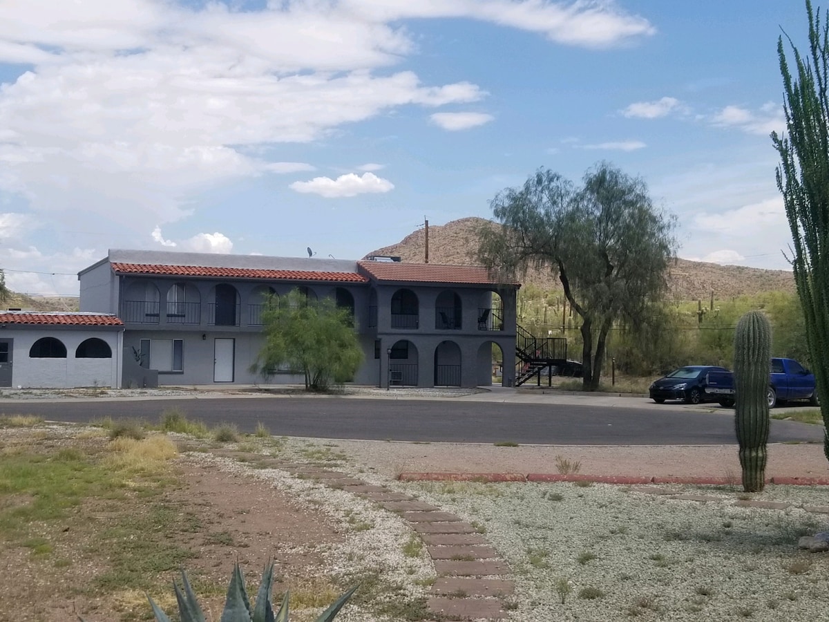Relax in this peaceful, remodeled 2 bdr, 1 bath + den home, w/centar A/C and tankless water heater. Stunning mountain views & sunsets. Accommodating upto 8 guests. It features queen bed, trundle bed, sofa sleeper, futon and if needed inflatable dbl mattress. Located in a quiet, safe neighborhood w/easy access to Hwy 60 connected to 101 Fwy to get easily to Phoenix area. Superior is a copper mining town and home to numerous western movies. Enjoy hiking, biking, ATVs and other outdoor adventures.