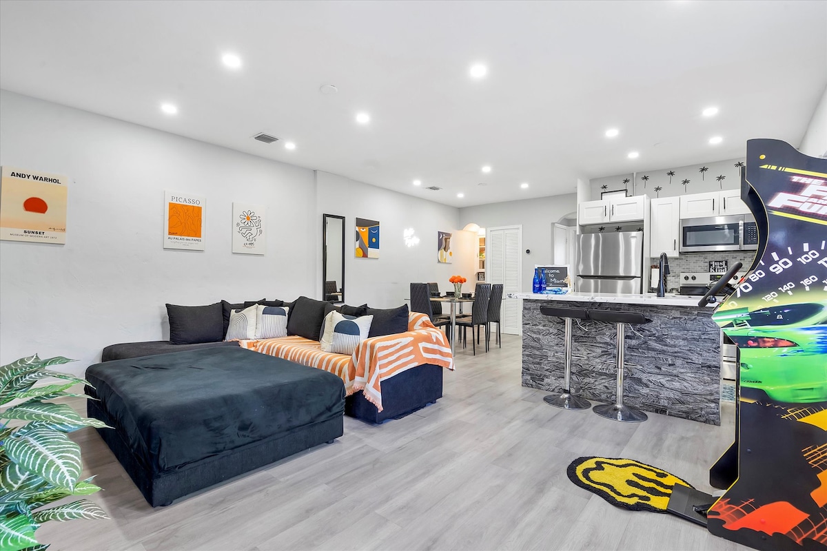 ¡Ubicación central! 1er piso con 2 dormitorios, 2 baños completos, estacionamiento gratis y patio exterior. A solo 7 min caminando de la playa. 🏝️ A pasos de los famosos restaurantes, tiendas y cafés de Española Way, con CVS y Walgreens abiertos 24/7. ⭐️ Muy cerca de Lincoln Road, Ocean Drive y el Centro de Convenciones. WiFi rápido, Smart TV (usa tu cuenta Netflix/Hulu, sin cable), A/C de ventana, lavadora y secadora en el edificio, y cámaras de seguridad 24/7. ¡Vive el estilo de South Beach!