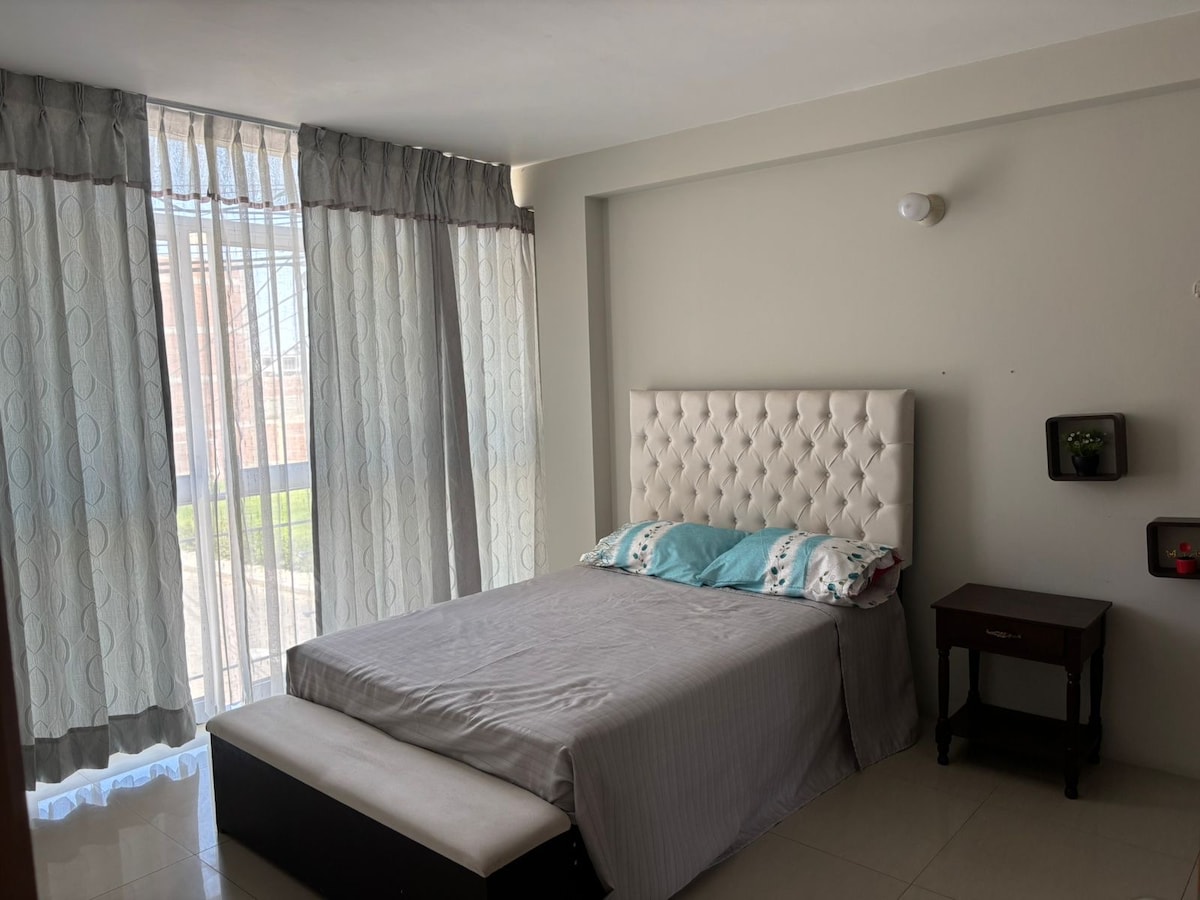 Disfruta de la sencillez de este departamento de estreno, 2do piso, tranquilo y céntrico. Ubicado muy cerca al hospital de la Solidaridad y a la Clínica La Luz, a 5 minutos del centro civico de la ciudad, totalmente amoblado, cuenta con dos habitaciones con smartv, sala comedor, cocina equipada con menajeria, lavadora y secadora, wifi, cochera en el mismo edificio.