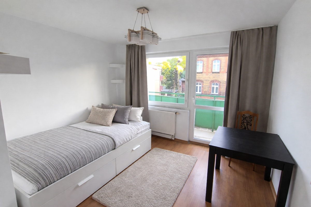 Zapraszam Cię do świetnie wyposażonego apartamentu w Tychach. Apartament ma 1 sypialnię oraz salon z rozkładaną kanapą, kuchnia,łazienka oraz balkon z widokiem na las. Idealny dla 3 osób, ale może pomieścić 4 osoby. Czekają gry, PS4, wifi, książki i sprzęt do ćwiczeń. Apartament znajduje się w spokojnej części Tychow, na miejscu jest swietnie wyposażony sklep czynny 6:00-23:00, restauracja oraz kawiarnia. 10 min pieszo do stacji kolejowej oraz 1 min do przystanku komunikacji miejskiej.