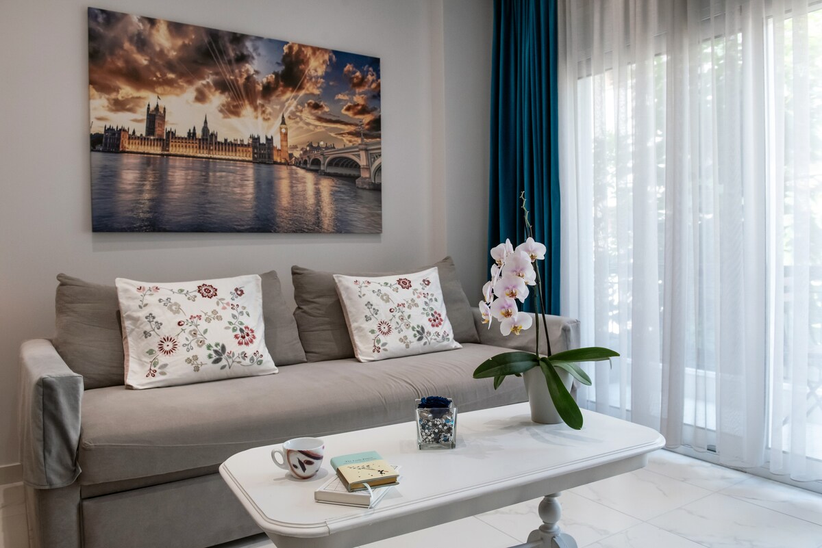 70 sqm meter luxurious apartment 15 minutes from the city center. Access via walking, bus, subway. Top floor, balcony with mountain view above the old town of Thessaloniki. Contemporary, smart design, with the finest materials and wooden finishes. Fully equipped kitchen, Nespresso, 50" TV, high speed internet, Netflix and Disney+, premium mattress,washer/dryer Seconds from seafront, 10 minutes from the Music Hall Ideal for business travellers and sightseers.