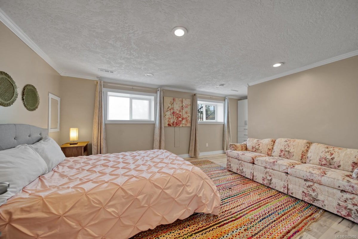 Welcome to a cozy and comfortable basement suite in beautiful Sooke! The Sooke Serene Suite is perfect for couples, small families, or solo travelers seeking adventure in a coastal forest and oceanfront community. Featuring a private entrance, one bedroom with a comfortable queen-sized bed, a living room with a sofa bed, full kitchen, full bath and in-suite laundry. Located in a quiet residential area, our suite is a short drive from all major beaches, trails, restaurants, breweries and shops.