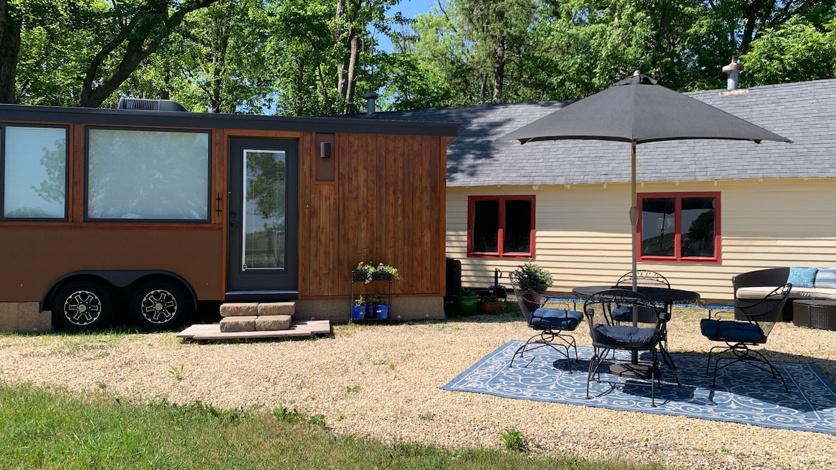 ¡Una estadía para los curiosos de la granja! Disfruta de una minicasa contemporánea /rústica para disfrutar de una experiencia glampin con acres de bayas y cientos de pollos El espacio incluye: - Cocina pequeña con microondas, heladera y cafetera. - Cama de tamaño completo y futón (para 4 personas) - Barracón adicional por un cargo adicional (capacidad para 3 personas) - Terraza, asientos al aire libre, anillo de fuego/ barbacoa - Oficina privada, anillo de fuego y hamaca. - Acceso a la estación de enjuague al aire libre (piensa en la ducha), Gana credibilidad en el campo uniéndote a las tareas