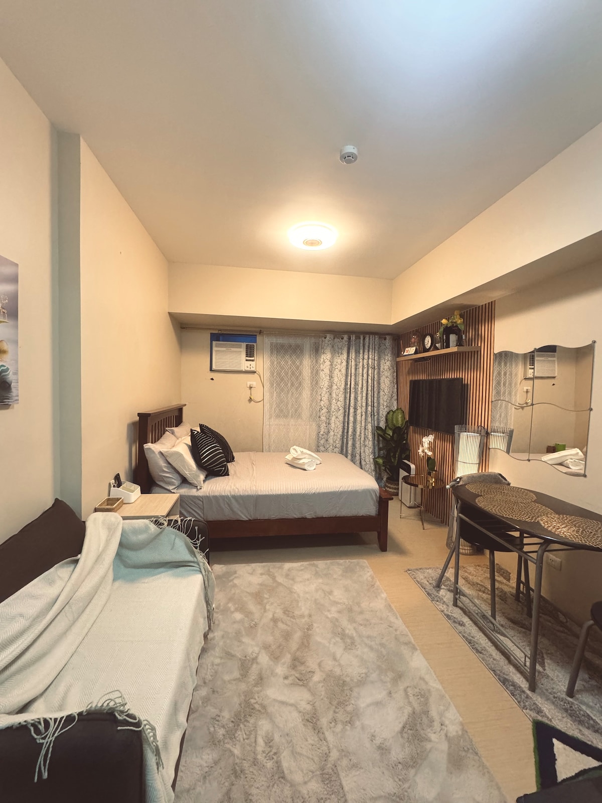 La unidad de apartamento está a poca distancia a pie de restaurantes, tiendas, un hospital y el centro comercial Ayala. El entorno es seguro. Hay seguridad las 24 horas y personal asignado en el vestíbulo. En el edificio hay ascensor. El interior de la unidad de estudio es acogedor y cómodo. Viene con 2 camas de matrimonio. Puede alojar hasta 3 huéspedes. Se proporciona conexión wifi a internet, ideal para llamadas por internet y navegar por la web.