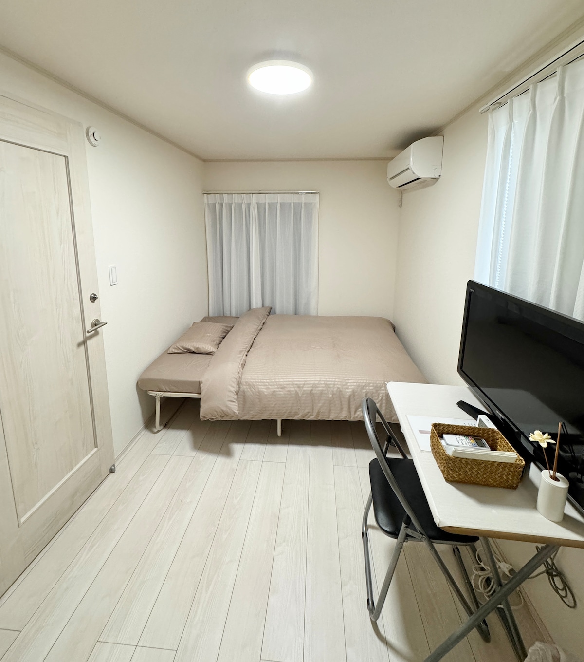 Just a 2-minute walk from the station, Palette House is a cozy and stylish retreat perfect for exploring Tokyo. The industrial-style kitchen includes an island bar, full cookware, wine glasses, and a water dispenser—ideal for cooking and evening drinks. The living room features natural driftwood décor and a comfy sofa, while the Japanese-modern bedroom offers a refined, relaxing space. With thoughtful amenities and warm design, it’s a perfect base for couples and families.