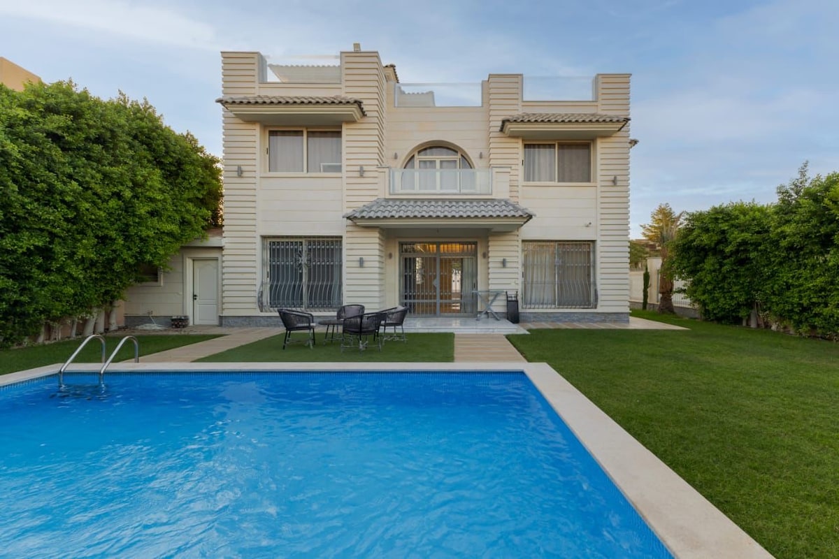 El alojamiento de la villa ofrece aire acondicionado y un balcón. Esta villa ofrece piscina privada, jardín, instalaciones de barbacoa, wifi gratuito y aparcamiento privado gratuito. Hay (6) dormitorios en la villa, una sala de estar, TV de pantalla plana vía satélite, una cocina equipada y (7) baños con bidé y ducha, así como una terraza y vistas a la ciudad. Hay toallas y sábanas disponibles en la villa. Los huéspedes pueden disfrutar de la piscina cubierta. El alojamiento de la villa está a 23 km de las pirámides de Guiza. El aeropuerto internacional Sphinx está a 25 km de la propiedad.