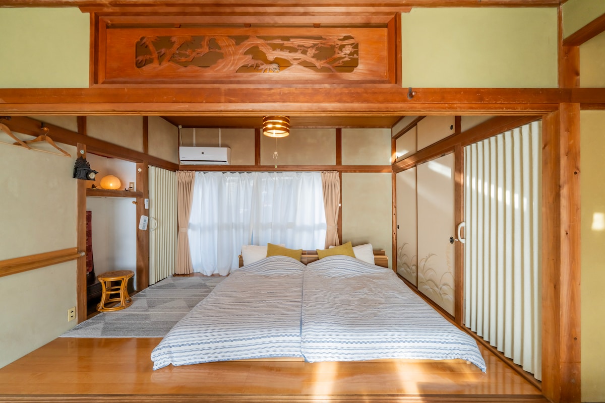 Una casa privada de dos pisos en una zona tranquila de Kitakyushu. Capacidad para 8 personas. Disfruta de la barbacoa y la diversión de temporada en el jardín: cerezos en flor en primavera, juegos acuáticos en verano, fogatas y batatas en invierno. Cocina totalmente equipada, 2 baños y artículos para niños incluidos. A 15 minutos en coche: Costco, Muji, Don Quijote. A 12 minutos a pie de la estación de Orio. Alquiler de bicicletas gratuito. Nota: 4 camas + 4 futones. [Licencia: 北九州市司令保保西第50660049号]