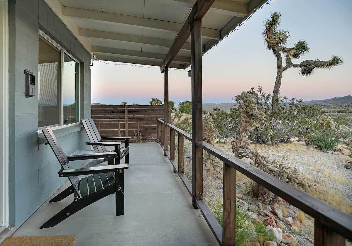 Ubicada en la cima de la Mesa, esta casa de nueva construcción en 10 acres de tierra ofrece vistas al Parque Nacional durante el día y destaca la vasta Vía Láctea por la noche. Sumérgete en la bañera doble con patas de garra y contempla un mar de árboles de Josué o admira el cielo del desierto en el porche trasero mientras las estrellas fugaces se elevan sobre tu cabeza. Si buscas una escapada lejos de las multitudes, pero aún cerca de toda la «diversión» que Joshua Tree y Yucca Valley tienen para ofrecer, no busques más allá de Ladera House.