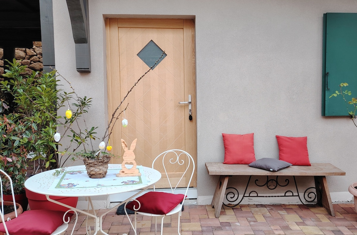 -Etage indépendant dans une maison typique à 650m d'altitude dans un tout petit village. - Le logement est de plein pied mais l'accès se fait par un escalier. - 2 chambres de 1 lit 2 places séparées par un salon/salle à manger/cuisine d'appoint, SDB. Attention, l'une des 2 chambres est traversante (pour aller aux toilettes la nuit...). - Grande terrasse de plein pied à demi-couverte. - Au calme!