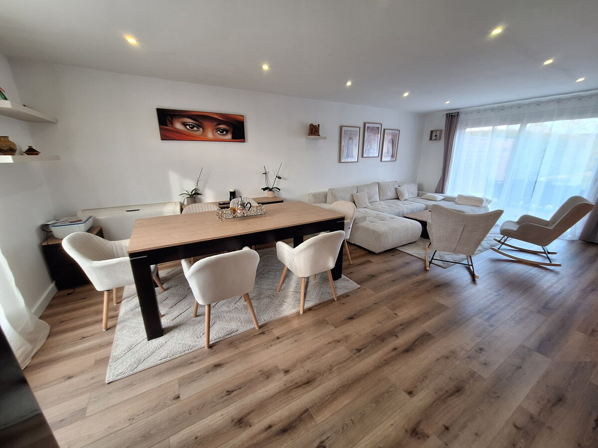 Alojamiento tranquilo y elegante , reformado , con todas las comodidades con terraza cubierta y jardín privado Situado a 3 minutos de las tiendas , a 5 minutos del centro de la ciudad de Troyes , a 10 minutos del centro de las tiendas de fábrica McArthurglen , a 20 minutos de los lagos y a 30 minutos del parque Nigloland 1 plaza de aparcamiento privado gratuita en aparcamiento seguro Opcional: posibilidad de garaje privado por 8 €/noche bajo reserva Plancha disponible desde mediados de abril hasta mediados de octubre Cuna y trona a petición