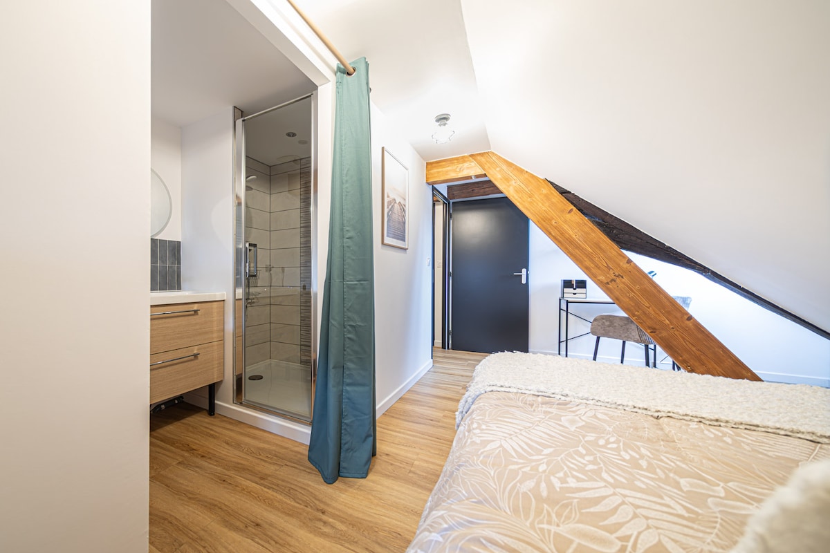 Bonito apartamento que hemos renovado poniendo todo nuestro corazón para que nuestros huéspedes se sientan como en casa. En un estilo más bien industrial en la sala de estar este lugar es perfecto para pasar un momento cálido. La habitación está decorada en un estilo bohemio para hacer este lugar aún más relajante. La entrada del apartamento se encuentra en el segundo piso, pero hay un rellano adicional para acceder a él. Llegada totalmente autónoma, por lo que podrá conciliar la tranquilidad y la discreción.