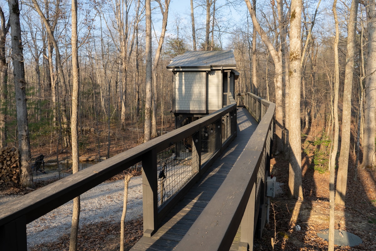 Vuelve a conectar con la naturaleza en esta escapada inolvidable a la casa del árbol. Una de las pocas cabañas de la casa del árbol en Tracy City, ubicada en 2 acres de hermoso terreno boscoso. Estamos a menos de 1 milla del Parque Estatal South Cumberland con acceso a rutas de senderismo, arroyos y vistas a la montaña. Disfruta de los sonidos del bosque en nuestra terraza elevada o relájate en el jacuzzi privado de abajo. El espacio al aire libre recién renovado incluye una parrilla, chimenea, estanque y sillas de huevo colgantes.