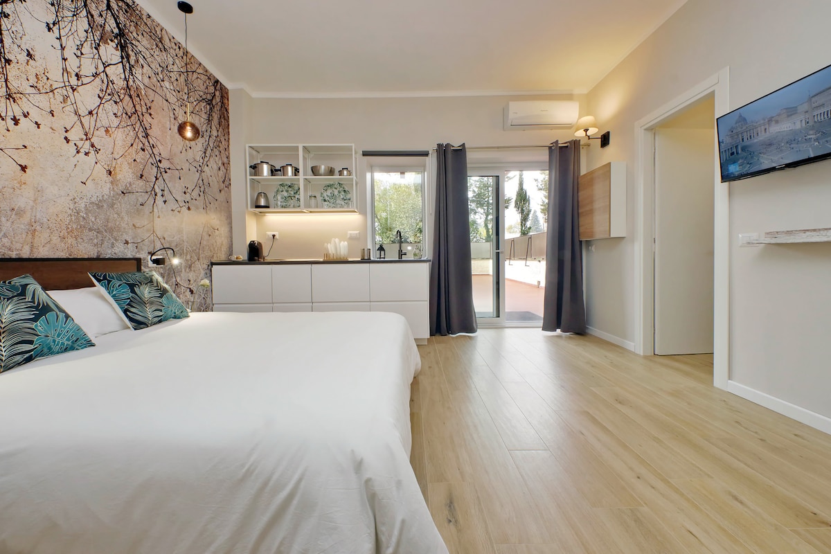 Monolocale ristrutturato al 4 piano del Residence Parco Tirreno, immerso nel verde, composto da una camera da letto con angolo cottura (con piastra elettrica, macchina del caffè, forno a microonde e bollitore per acqua), bagno e terrazzo di 10 mq. L'appartamento si trova a 7 minuti a piedi dalla metro A (500m dalla stazione Cornelia). La struttura offre una serie di servizi: parcheggio gratuito per gli ospiti, portineria H24,ampi spazi nel parco verde e una piscina a pagamento gestita da terzi