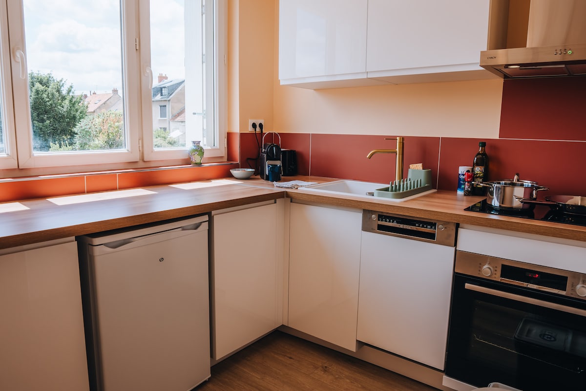 En el corazón de la ciudad, disfrute de mi hermoso y cálido apartamento de 76 m², cerca de todas las tiendas. Consta de una gran sala de estar/salón, cocina equipada (horno, placa de inducción, lavavajillas, tostadora, hervidor de agua...), dormitorio, baño, bañera, inodoro, lavadora, wifi de fibra, palitos de café, té y azúcar (sin cafetera). Aparcamiento gratuito y/o de pago cerca. Sábanas, toallas y artículos esenciales incluidos (excepto gel de ducha). Llegadas anticipadas y salidas tardías bajo condiciones.