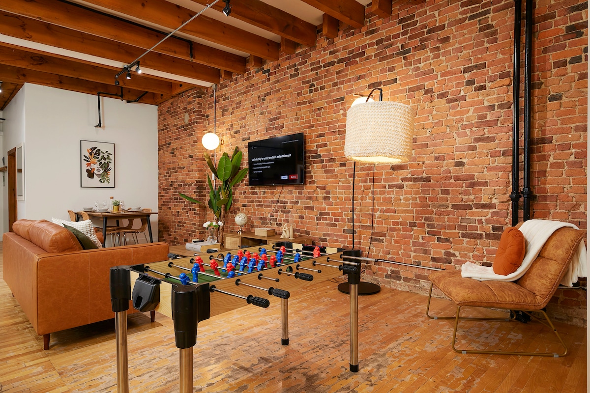 Stunning Old Port penthouse combining historic charm with sleek modern design. Sleeps 8 across one private bedroom and two stylish lofted rooms, each with tall partitions and locking doors. Soaring ceilings, exposed brick, and warm, elegant finishes throughout. Enjoy a chef’s kitchen, 65" HDTV & projector for movie nights, a gaming nook, and a compact office space. Steps from Montreal’s best dining, shops, and culture.