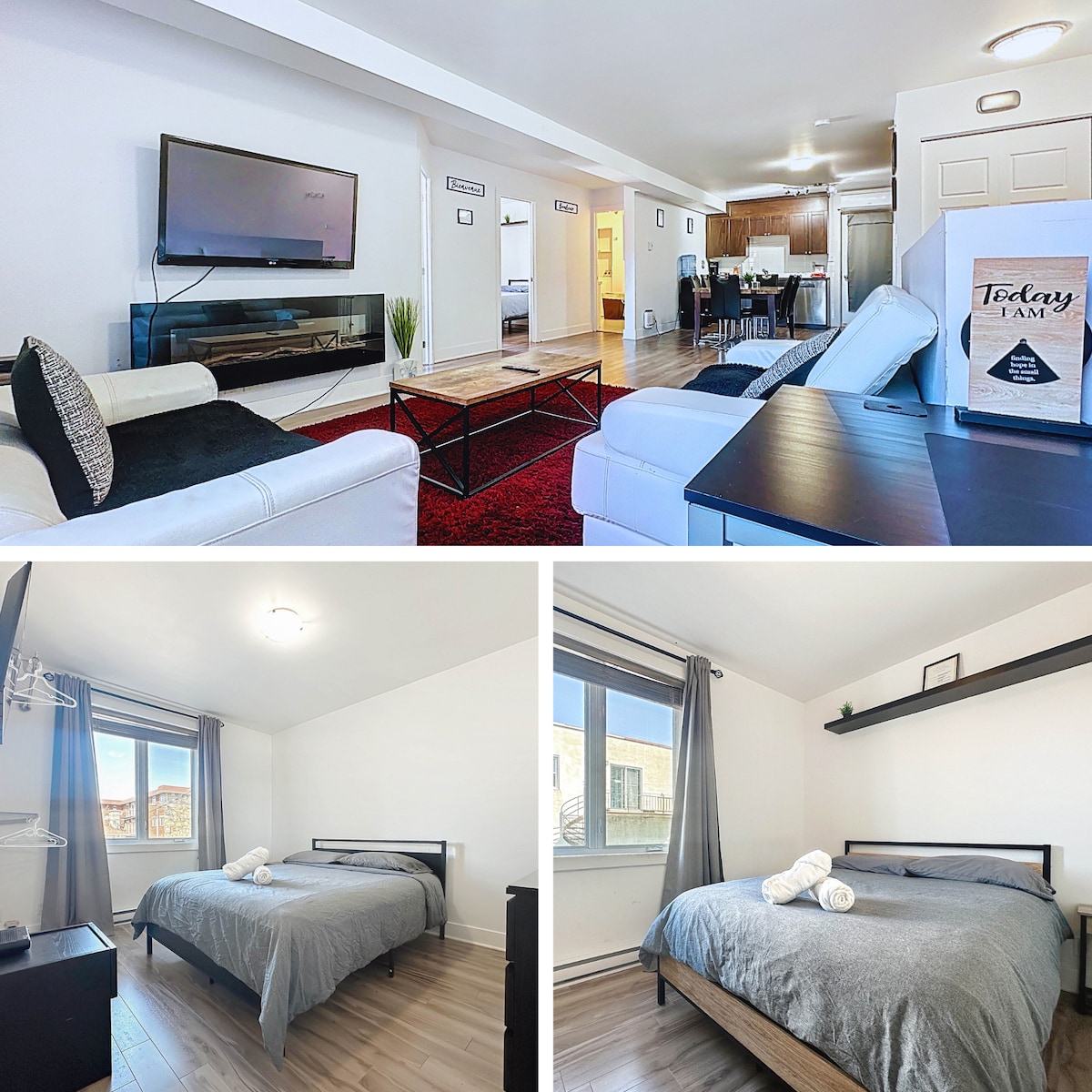 Apartamento espacioso y espacioso. Sala luminosa con acceso al balcón y vista al vecindario. Perfecto para una familia de 6 o 3 parejas que viajan juntas. 2 dormitorios privados 1 .ª: cama king (o dos individuales) 2º: cama tamaño queen 1 sofá Cocina y baño bien amueblados. Appartement spacieux et débordant de lumière Grand salon doté d'une porte-patio qui tunnel à balcon. Perfecto para una familia de 4 o 2 parejas que viajan juntas. 2 CAC. 1ere: 1 King (ou 2 simples) 2eme: 1 Queen 1 sofá iluminado CITQ:294658