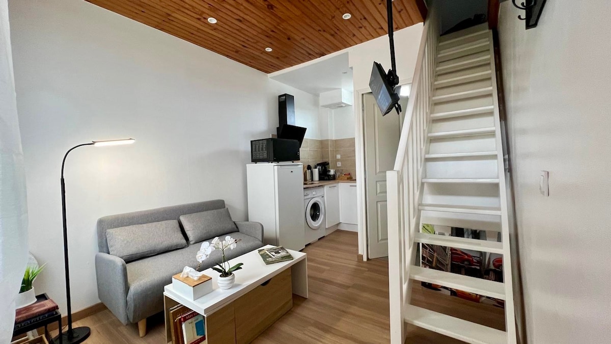 Petit duplex original situé en plein coeur du centre ville de Montreuil et à 5 min de Paris. Le studio est composé d'un séjour spacieux et cosy. Une salle d’eau. Le coin cuisine est équipé d’un frigo, four combiné micro-onde et machine à laver. Vous accédez à la mezzanine par un escalier à marches japonaises. L’espace chambre se trouve dans la mezzanine-balcon avec vu sur le séjour.